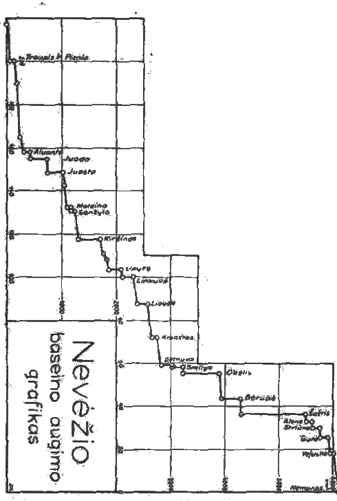 Baseino augimas atvaizduotas grafiškai; grafiko argumentai - atstumai nuo žiočių ir baseino plotai. Kreivės „slenkščiai" rodo intakų baseinų plotus. Baseino augimo atžvilgiu galima išskirti keturius Nevėžio ruožus: 1) iki Aluontės - maža upė beveik be intakų, 2) tarp Aluontės ir Dotnuvos žiočių - normalus intakų santykis, 3) tarp Kėdainių ir Šušvies žiočių - labai smarkus baseino augimas, 4) žemiau Šušvies baseinas eina didyn visai nežymiai.